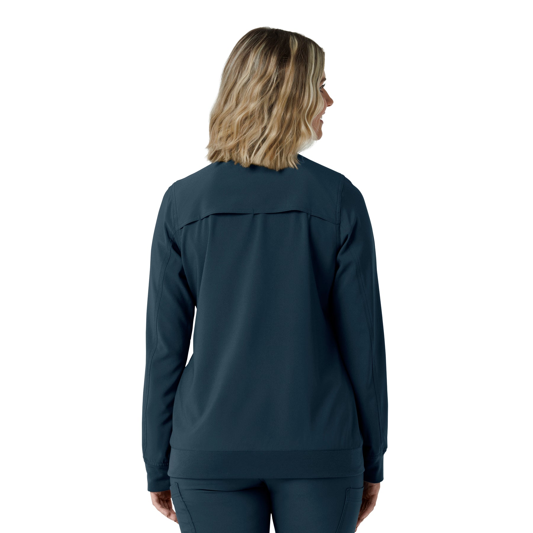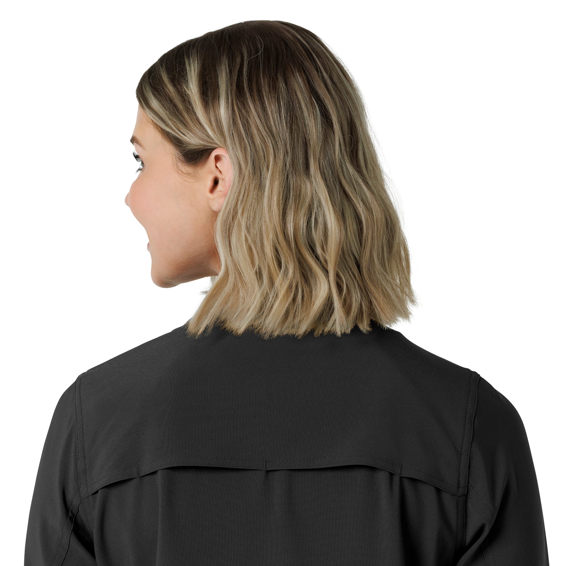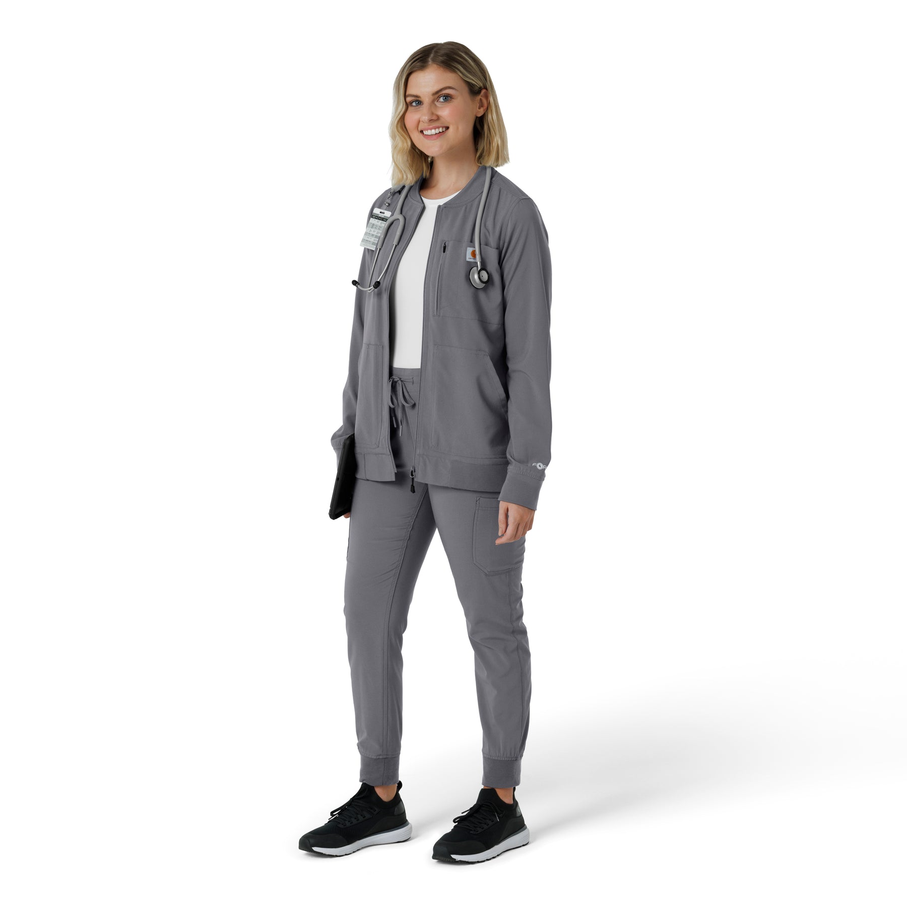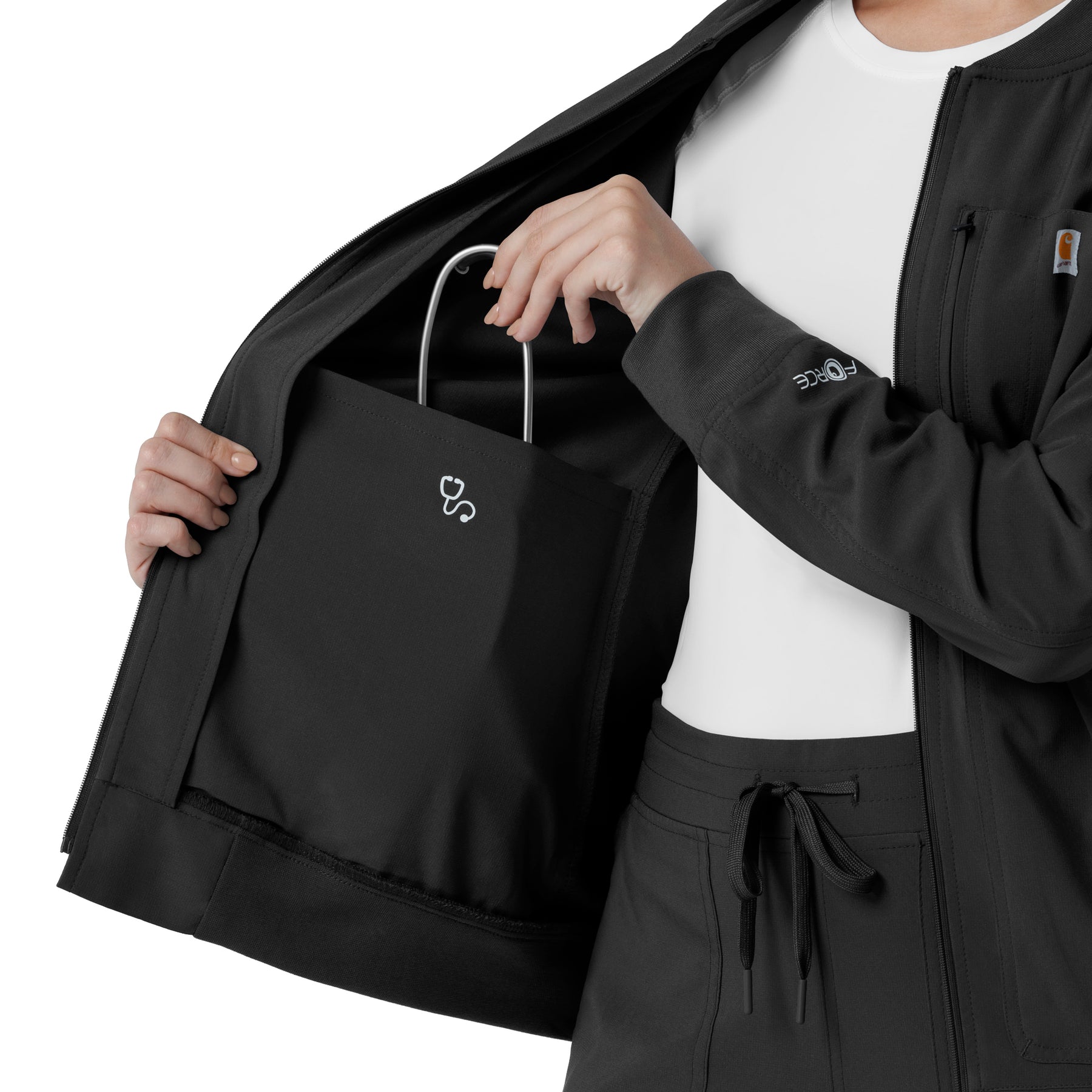 This women's Carhartt scrub jacket is a unique blend of classic workwear style and healthcare-specific functionality. At first glance, it resembles a traditional work jacket, but it's engineered to meet the unique demands of medical professionals. The Rugged Flex™ stretch fabric provides exceptional flexibility, allowing for unrestricted movement during busy shifts and demanding tasks. Functionality is a key focus, with a multitude of pockets strategically placed to keep essential tools and personal items organized and accessible. Notably, a dedicated stethoscope pocket ensures this crucial instrument is always within reach. The mesh-lined back vent promotes airflow, keeping you cool and comfortable even during long and strenuous periods. This jacket is designed to provide both durability and comfort. The robust construction ensures it can withstand the rigors of daily wear, while the thoughtful design details, such as the stretch fabric and ventilation, enhance overall comfort and performance. It's a reliable and practical choice for any healthcare professional seeking a durable and functional scrub jacket that can keep up with their demanding work environment.