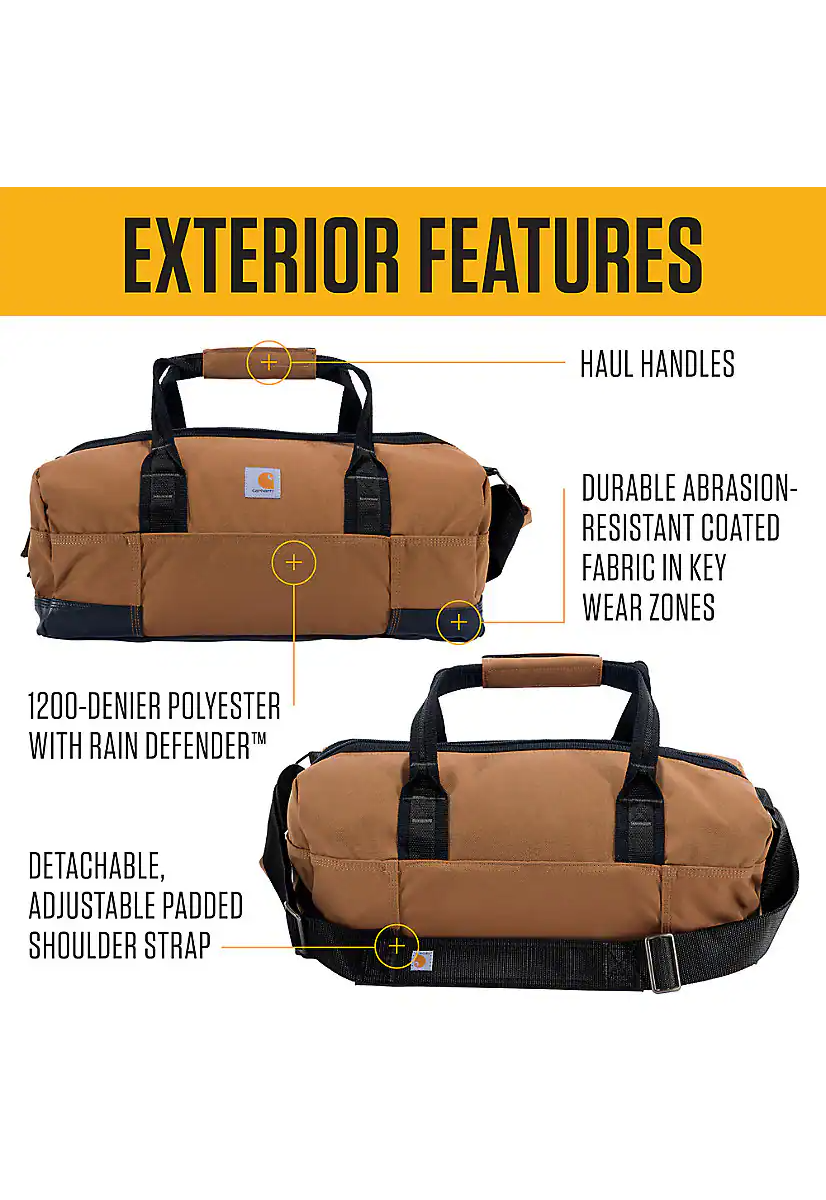 Pack it all up in this durable gear bag. At 20 inches, it fits your tools, cords, batteries, chargers, and just about anything else you need on the job. With one main compartment and an inner zip pocket, the duffel has a straight-forward design that doesn't mess around. It's made for the long haul, with heavy-duty material that stands up to light rain plus an abrasion-resistant base.