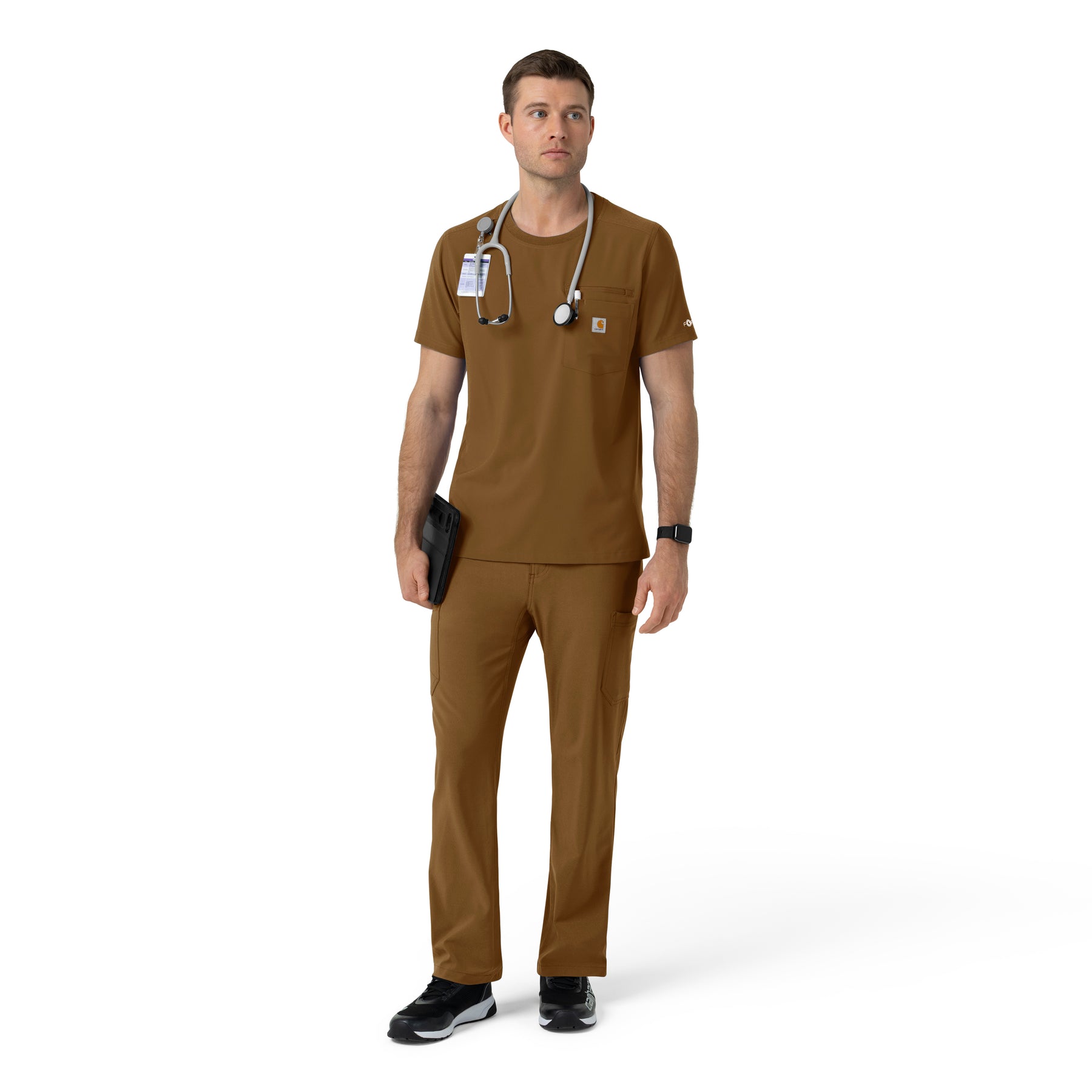 This men's Carhartt scrub top offers the best of both worlds: the relaxed feel of a t-shirt with the robust functionality of a professional scrub top. Engineered to withstand the demands of extended shifts and rigorous work environments, it's a reliable choice for healthcare professionals. Crafted from durable stretch polyester, it provides exceptional flexibility and long-lasting wear, ensuring you can move freely and comfortably throughout your day. Designed with practicality in mind, this scrub top features multiple pockets, offering ample storage for essential tools and personal items. A secure zip pocket ensures valuables remain safe and easily accessible. The integrated shoulder badge loop allows for clear and visible display of your ID, streamlining identification procedures and enhancing workplace efficiency. This Carhartt scrub top is built to endure, offering a blend of comfort, durability, and functional design. It's an essential piece for any professional who requires reliable workwear that can keep up with their demanding schedule.