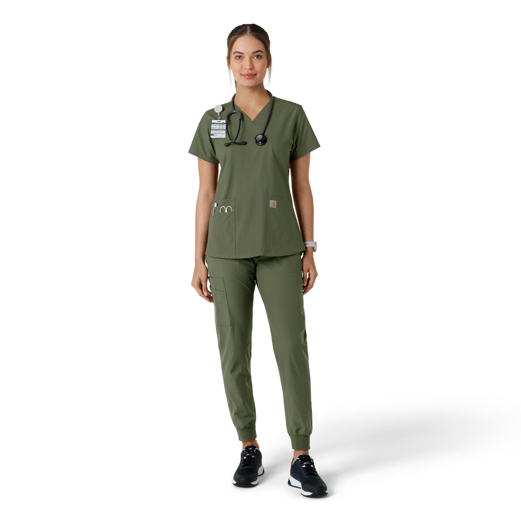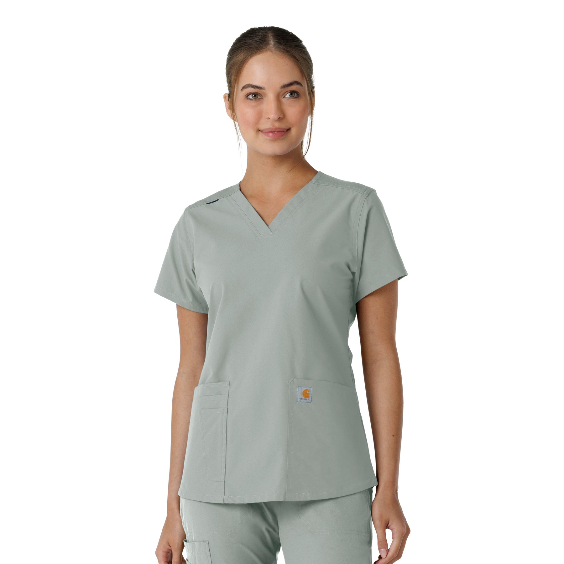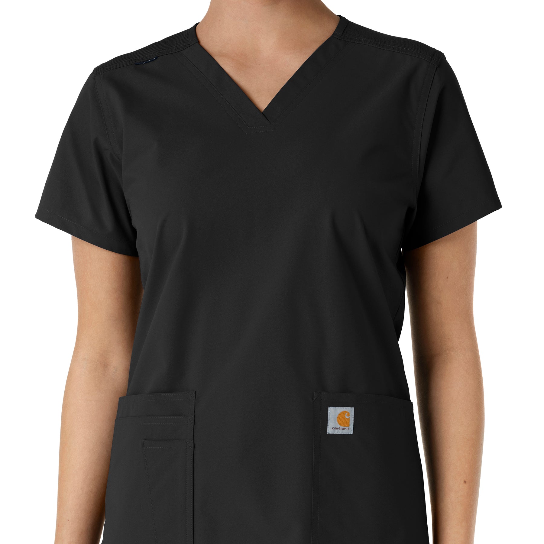 Stay comfortable and move freely with the Carhartt Force Essentials Women's V-neck Scrub Top. Featuring a back yoke knit panel, this top offers flexibility and a tailored fit with a 3/4" V-neckline and curved hem. FastDry® tech wicks away sweat, and Stain Breaker® makes stain removal easy. With two roomy front pockets, an ID badge loop, and dedicated cell phone and scissor pockets, it's built for utility and comfort.