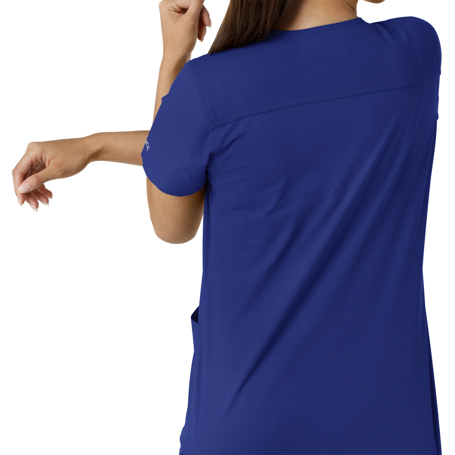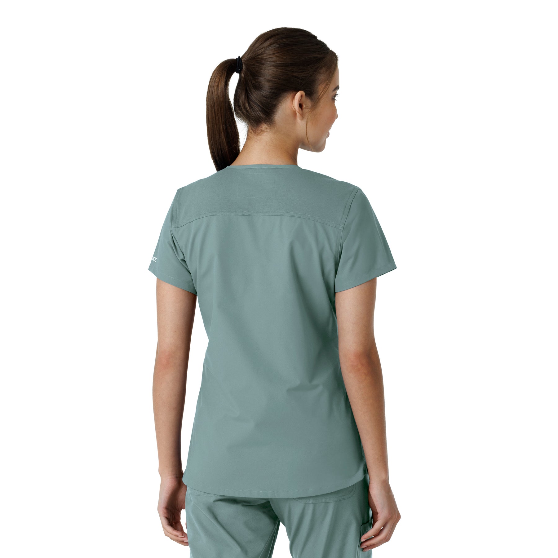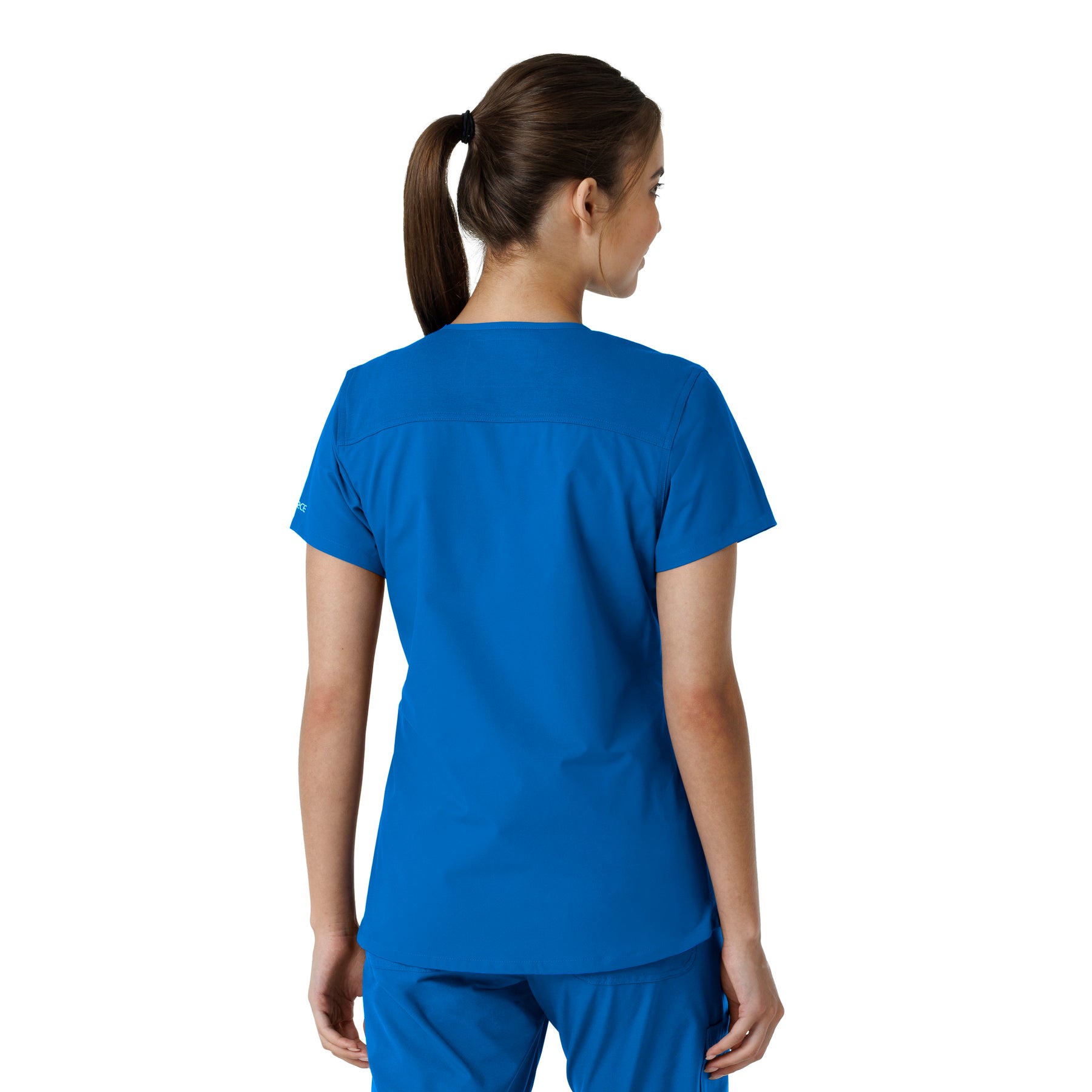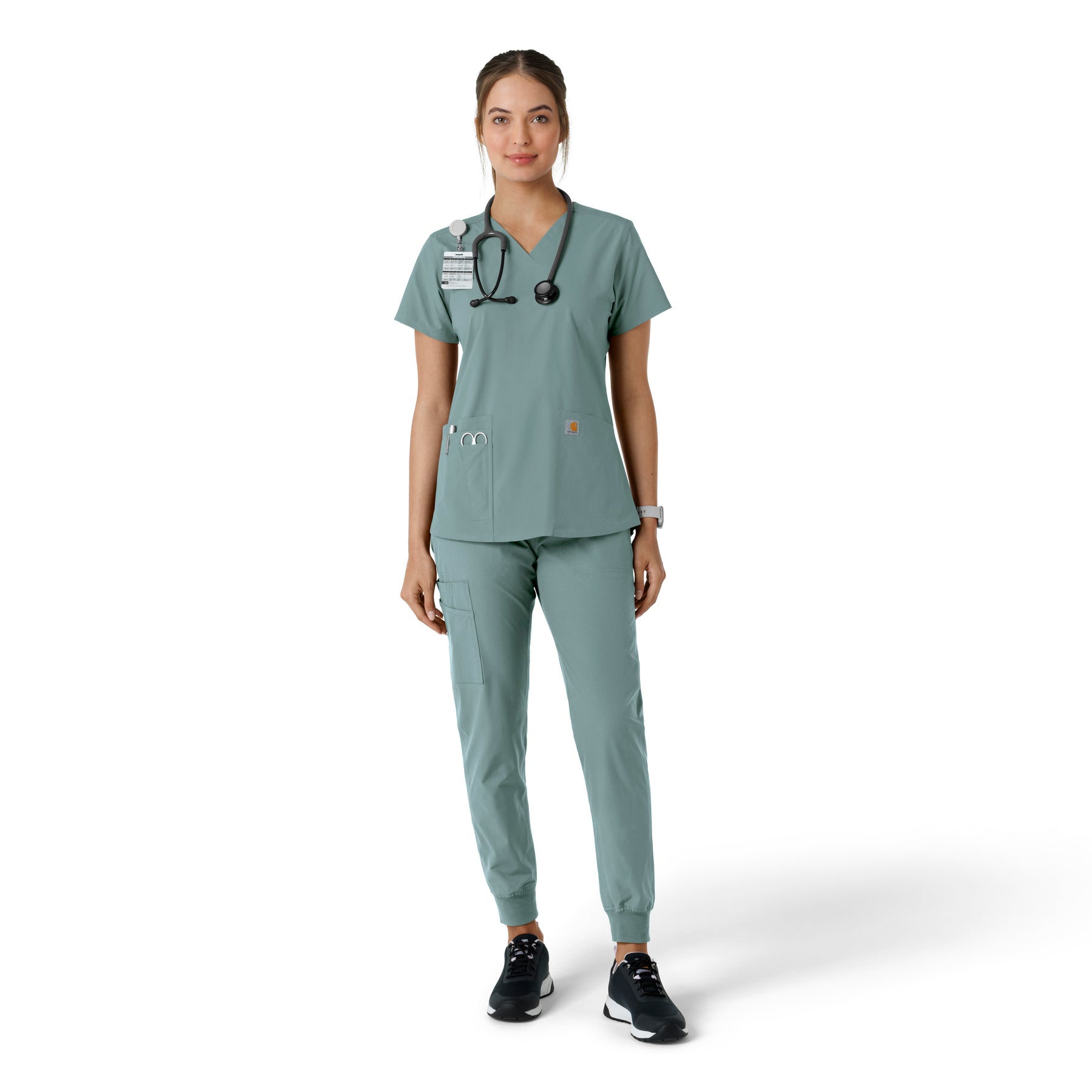 Stay comfortable and move freely with the Carhartt Force Essentials Women's V-neck Scrub Top. Featuring a back yoke knit panel, this top offers flexibility and a tailored fit with a 3/4" V-neckline and curved hem. FastDry® tech wicks away sweat, and Stain Breaker® makes stain removal easy. With two roomy front pockets, an ID badge loop, and dedicated cell phone and scissor pockets, it's built for utility and comfort.